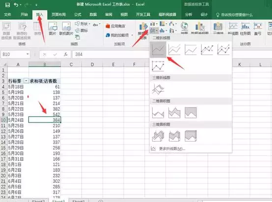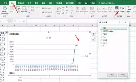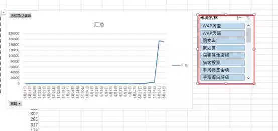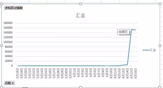 这个时候就会跳出一个折线图了,从这个图标我们就能很直观的看到他的变化情况。比如,从这个图表的时候我们就一眼看到了十五号流量突然猛增。之前基本没什么流量,但是会这个数据是所有数据,没办法看到他的流量渠道,所以接下来我们还需要做一个切片器