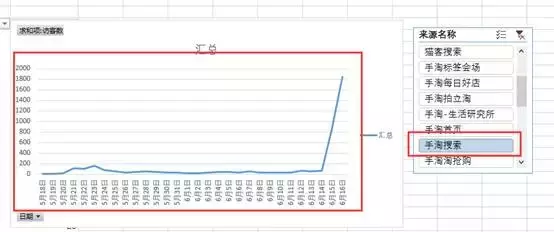 这个时候就会出现了这样的一个切片器。你可以点击你想要看到的数据,比如我想看看他的手淘搜索的情况是怎样的,那么你就可以点击一下手淘搜索