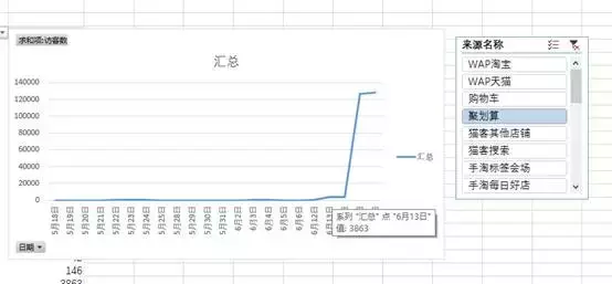 从这里你可以看出,他是在十三号开始聚划算比较多,达到了三千多一天,然后十五号的时候上万的聚划算流量,从这里我们可以看出,他十五号是上了聚划算的。
