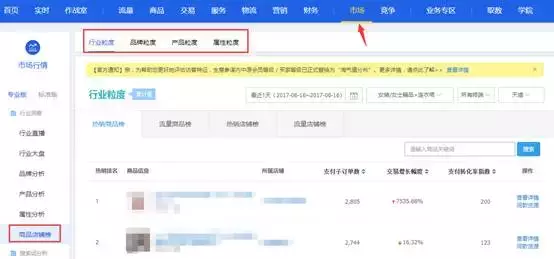 打开生意参谋,点击市场,然后点击左边的商品店铺榜,商品店铺榜有四个板块,行业粒度,品牌粒度,产品粒度,属性粒度。这四个板块对我们平时的数据分析的数据获取非常有用。